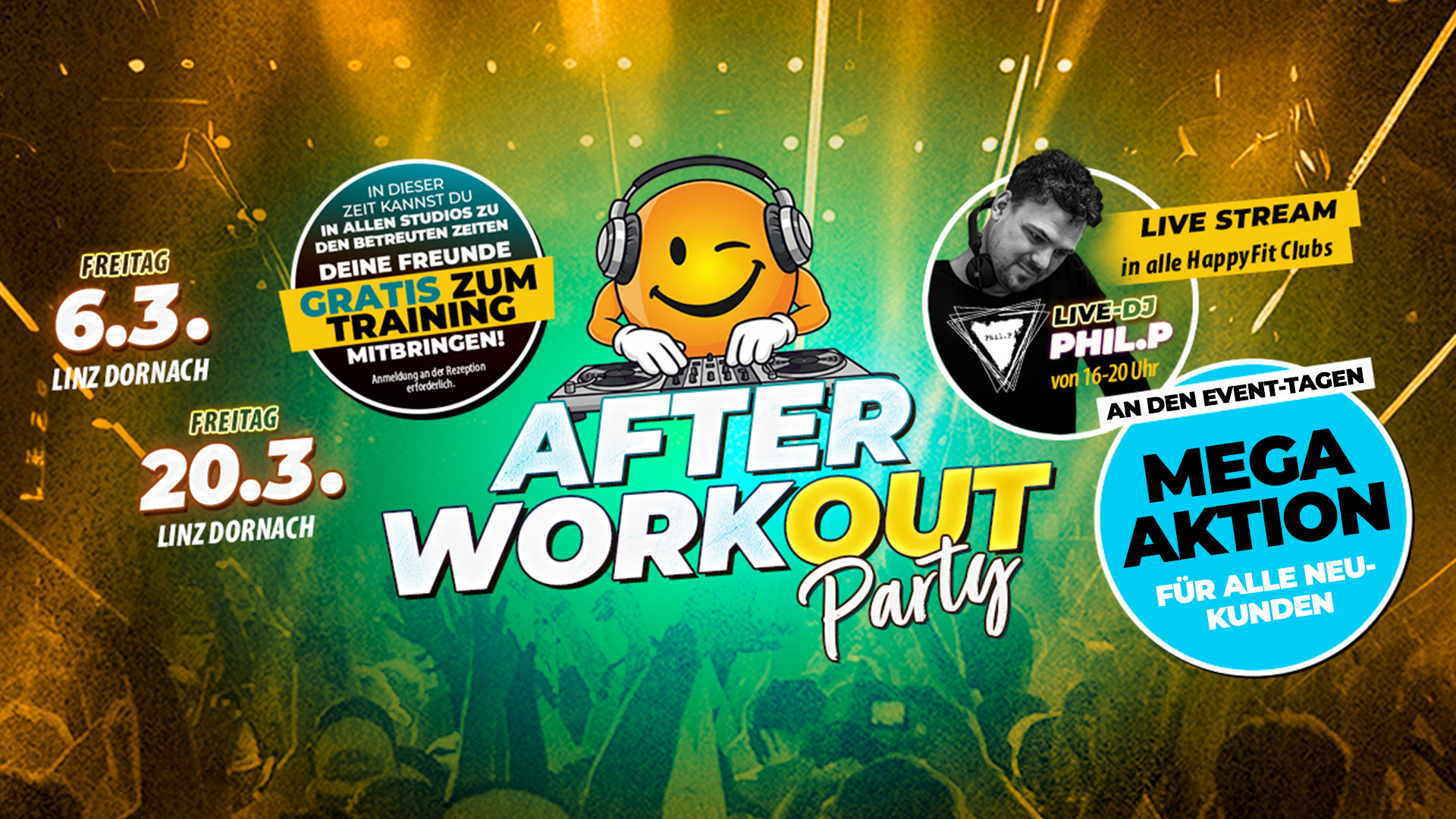 💥 Good News für alle HappyFit-Member und die es noch werden wollen: Wir verwandeln jeden zweiten Freitag im Monat unsere Fitnessstudios von 16–20 Uhr in eine ultimative AFTER WORK-OUT–Party-Location mit DJ Phil.P live on decks! In alle anderen HappyFit Clubs übertragen wir live! 💪