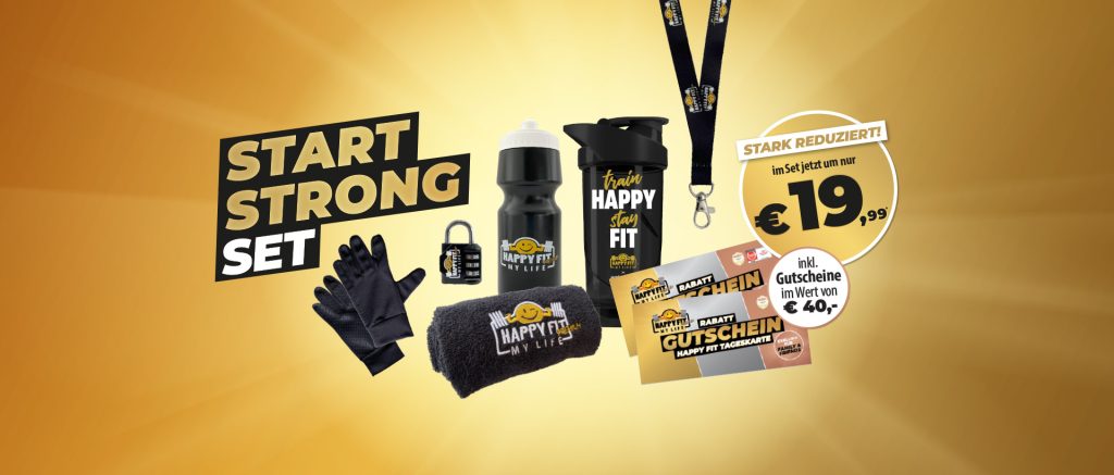 Good News für alle, die jetzt Mitglied in der HappyFit-Family werden wollen: Ab sofort könnt ihr optional ein exklusives START STRONG Zusatzpaket im HappyFit-Style zum Aktionspreis erwerben! Das Paket beinhaltet alles, was man für einen erfolgreichen Trainingsstart braucht und ist zu den betreuten Anmeldezeiten in allen HappyFit Studios in Österreich sowie online erhältlich!