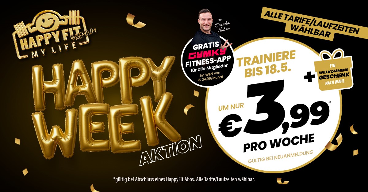 - Aktion gültig am Mi, 15.4. für alle Neukundinnen und Neukunden bei Anmeldung in allen HappyFit Studios in Österreich und online.